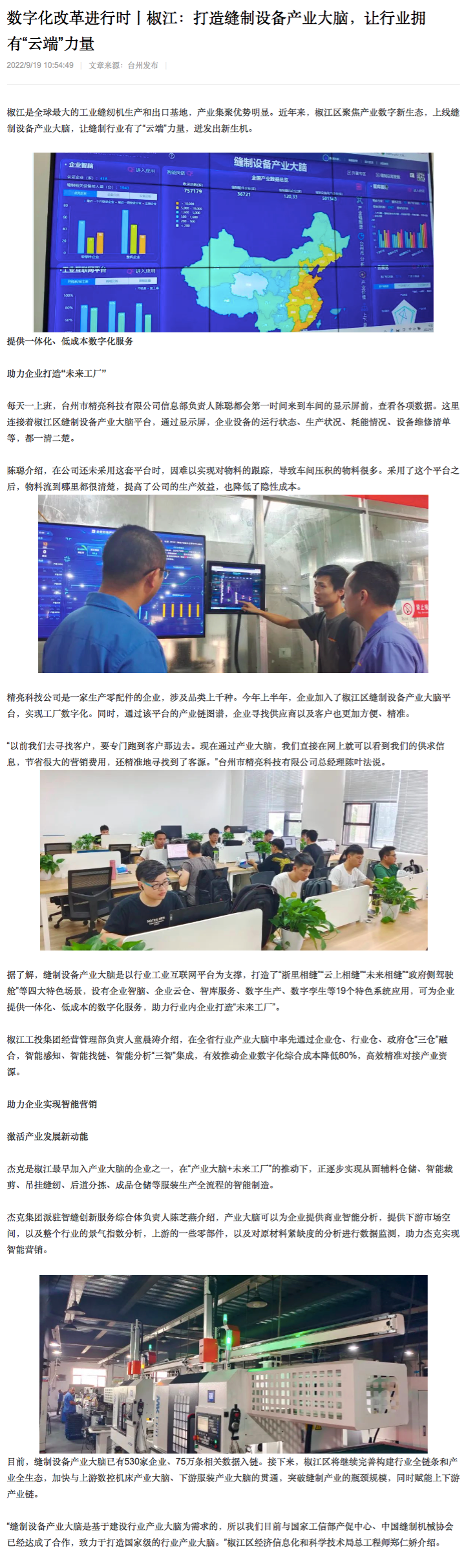 数字化改革进行时丨椒江:打造缝制设备产业大脑,让行业拥有“云端”力量